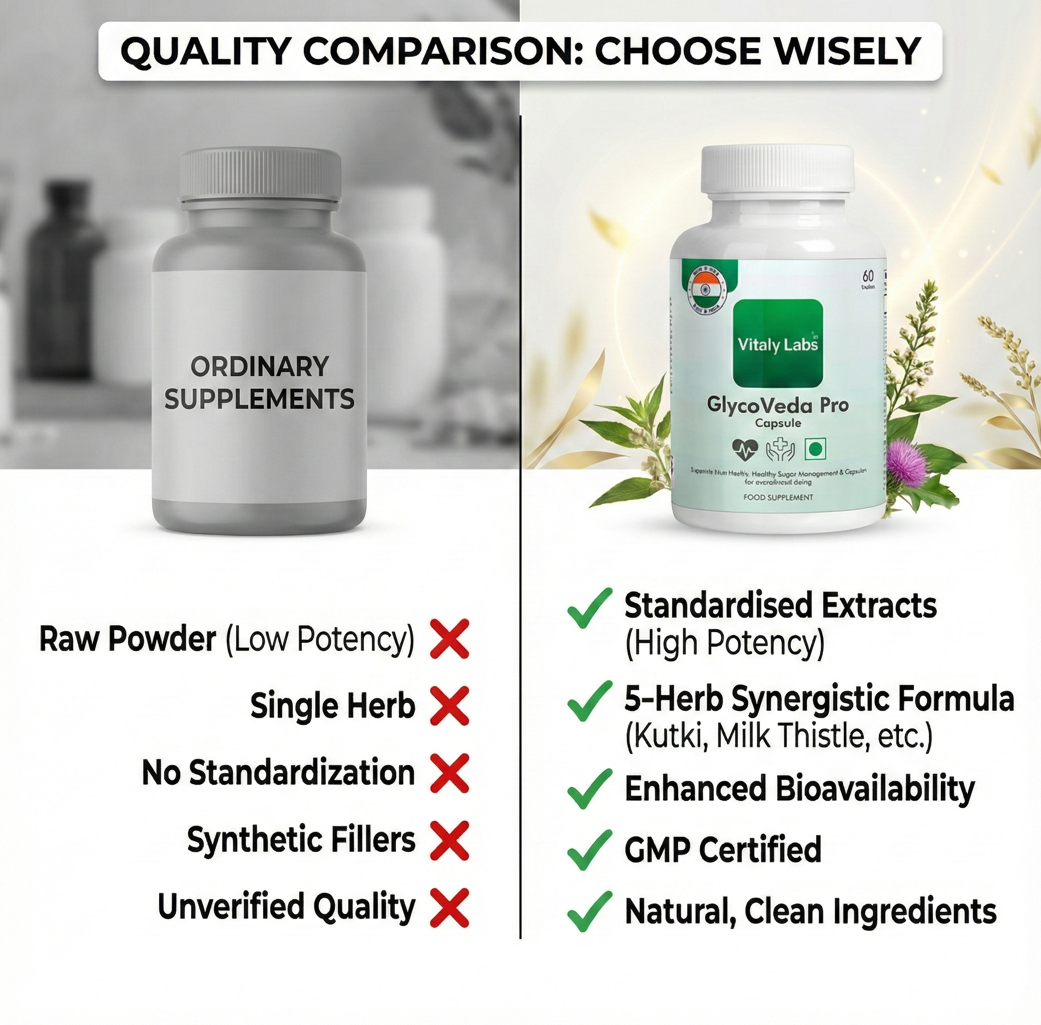 Gaurav bhai, I thought the same initially. But those cheap churnas use raw herb powder — no standardised extracts. Glycoveda Pro has 97% pure Berberine, 80% Silymarin, 25% Gymnemic acids. This is pharmaceutical-grade extraction, not kitchen grinding. I calculated — I was spending ₹8,000+ monthly on medicines, tests, and doctor visits. After 3 months of Glycoveda Pro, my doctor REDUCED my medicines. Long term it's actually saving me money AND my organs. Quality costs, but it delivers.