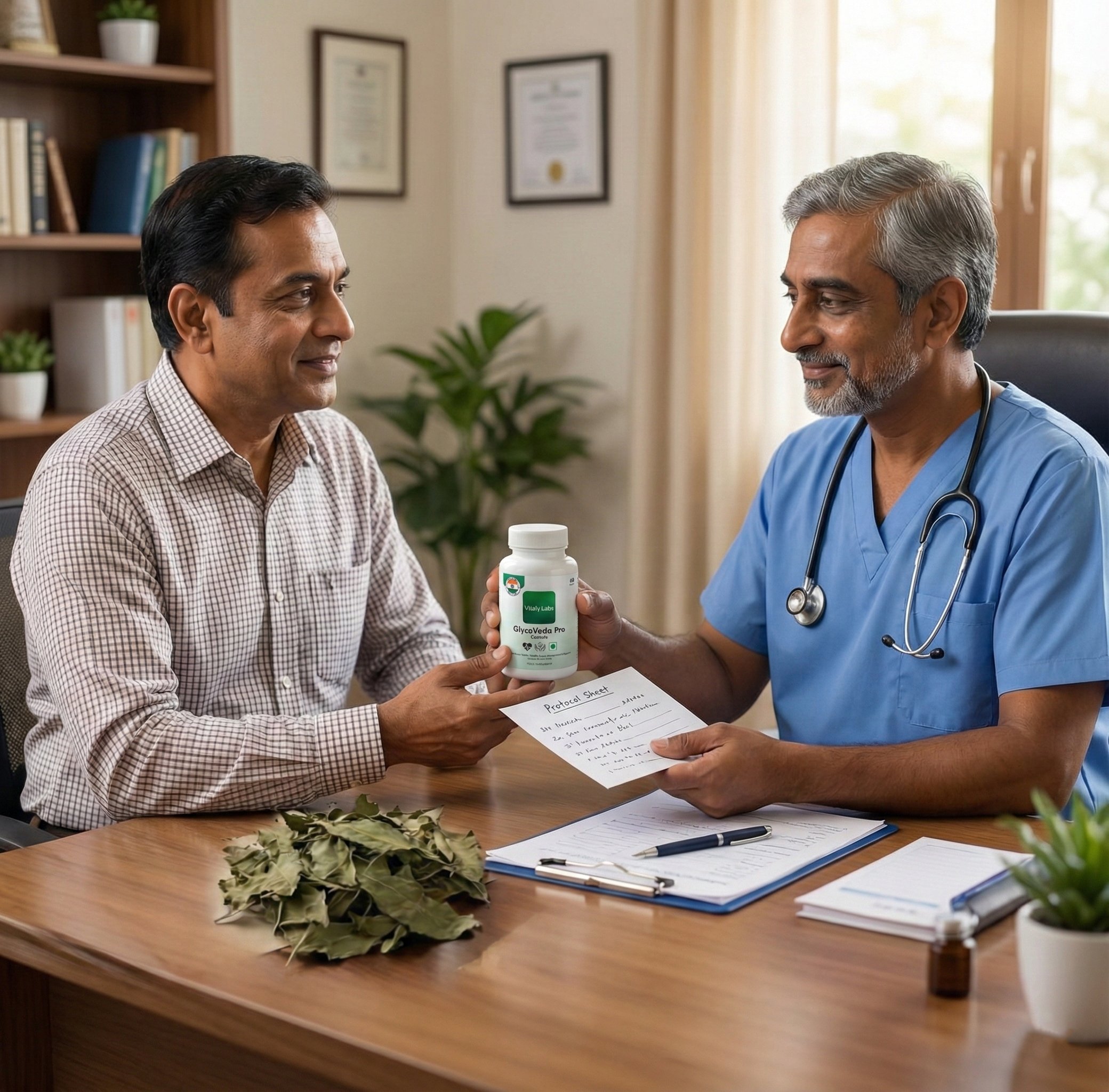 Ekta ji, yes absolutely safe to take alongside your existing medicines. Don't stop your medicines suddenly. Glycoveda Pro works WITH your treatment, not against it. As your readings improve over weeks, your doctor will naturally reduce dosages. I'm a retired physician and I recommend this approach to many patients — continue medicines + add Glycoveda Pro, then let the body heal gradually. Never stop medicines without doctor's advice.